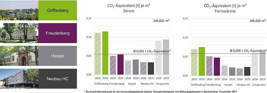 Klimagasemissionen unserer Universität pro Quadratmeter im Vergleich zu Universitätsgebäuden im Bundesdurchschnitt