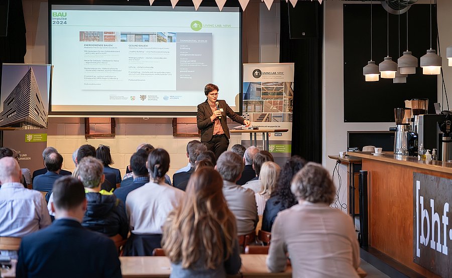 Der architektonische Scharm der ehemaligen Wiesenwerke an der Nordbahntrasse bot für die beiden Tage den Rahmen für hochkarätige Fachvorträge und den Austausch mit Referentinnen und Referenten aus ganz Deutschland und darüber hinaus. Zusätzlich boten Stationen in unterschiedlichen Häusern auf dem Gelände des Living Lab NRW vertiefende Einblicke in Forschung und Lehre innerhalb des Projektes: