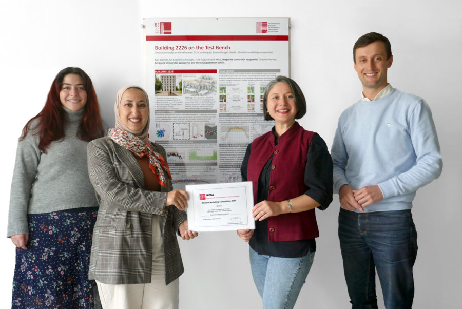 Isil Kalpkirmaz Rizaoglu, Tugcin Kirant-Mitic und Ghadeer Derbas und Karl Walther, Promotionsstudierende vom Lehrgebiet für Bauphysik und technische Gebäudeausrüstung (Prof. Karsten Voss) an der Bergischen Universität Wuppertal, wurden durch die International Building Performance Simulation Association IBPSA für ihre Simulationsstudie zum Bürogebäude „2226“ mit dem 1. Preis ausgezeichnet. Die Preisverleihung in der „Students modeling competition“ erfolgte im Rahmen der „Building Simulation“-Konferenz Anfang September im belgischen Brügge.